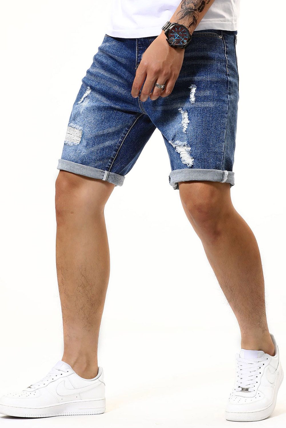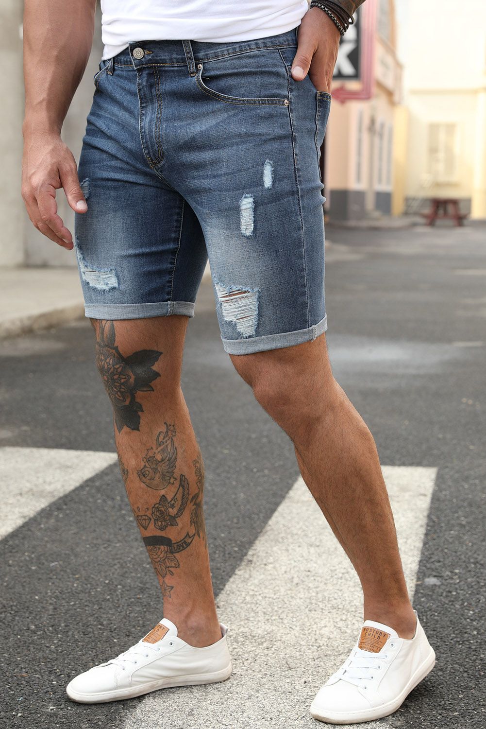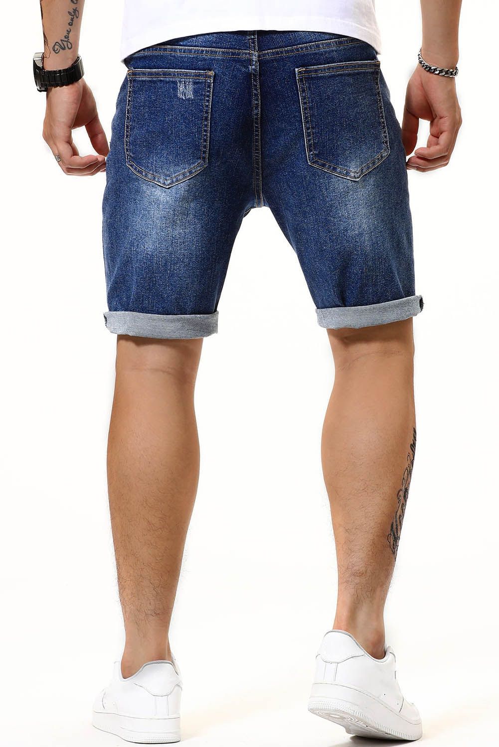 Distressed denim shorts with straight leg are casual and stylish