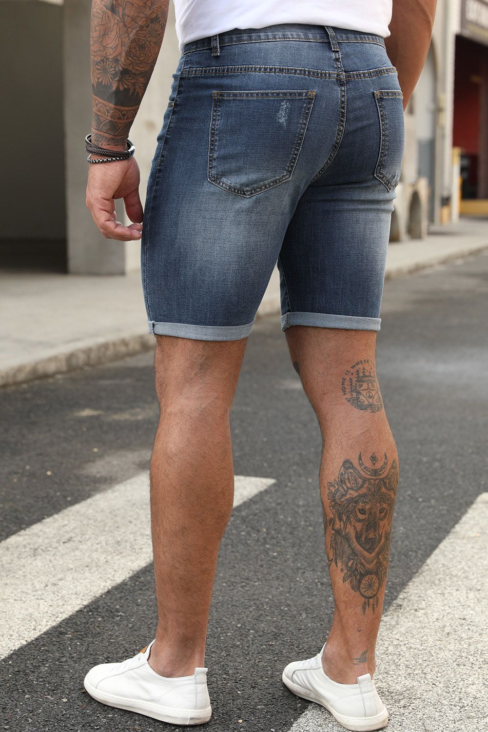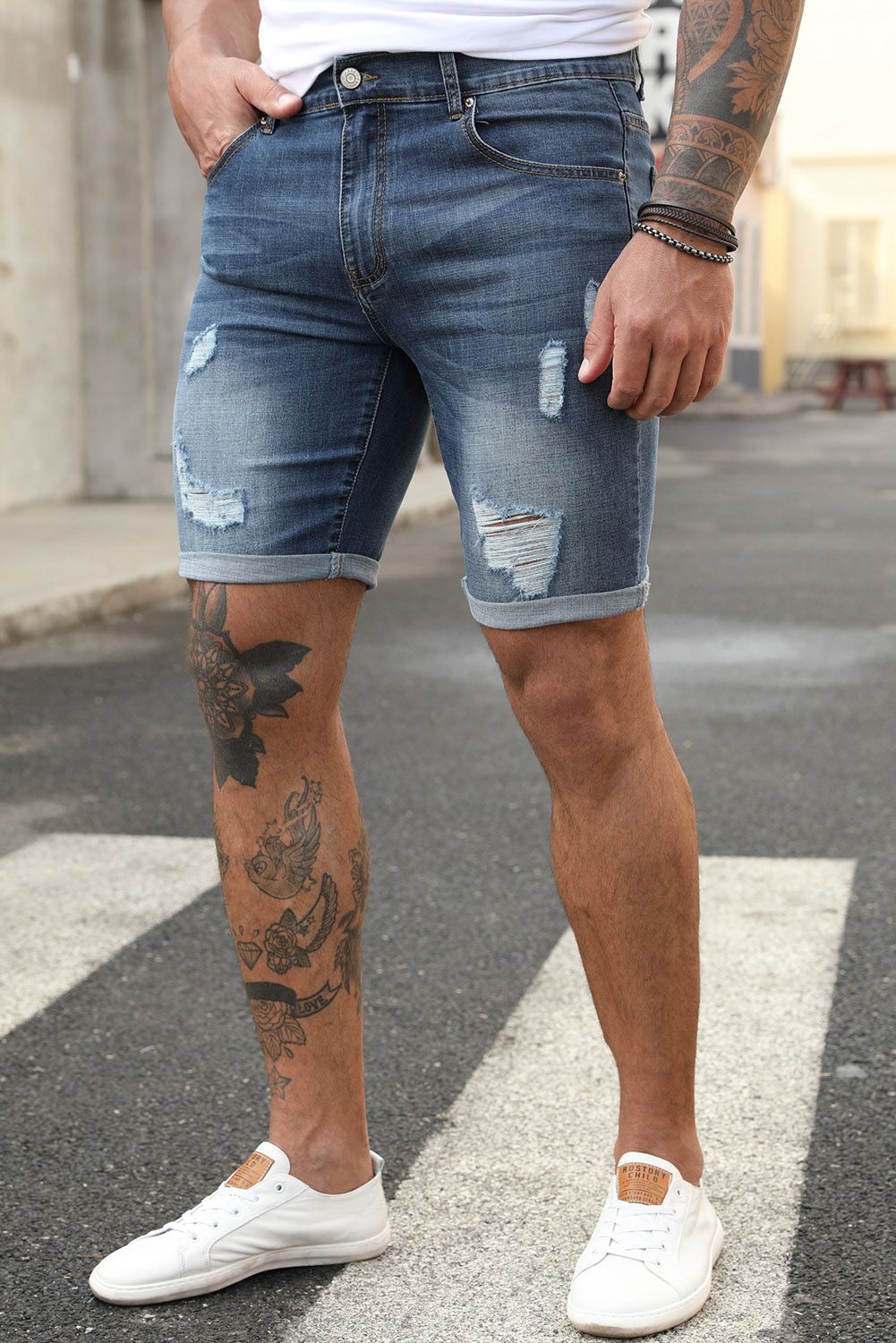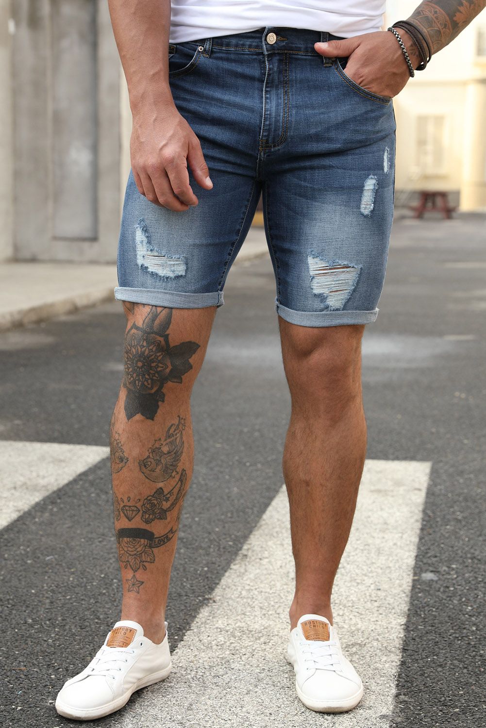 Distressed denim shorts with straight leg are casual and stylish