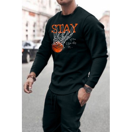 Black Men's Basketball Letter Print Long Sleeve Top and Pants Set