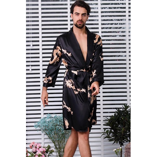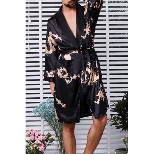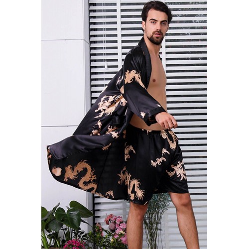 Black Dragon Print Lace-up Men Satin Nightgown