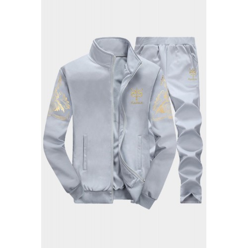 Gray Graphic Print Zip-up Hoodie and Sweatpants Men's Sports Suit
