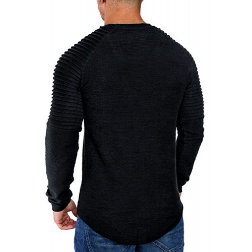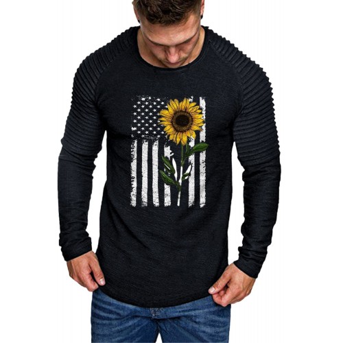 Black Men's Sunflower American Flag Print Pleated Long Sleeve Top