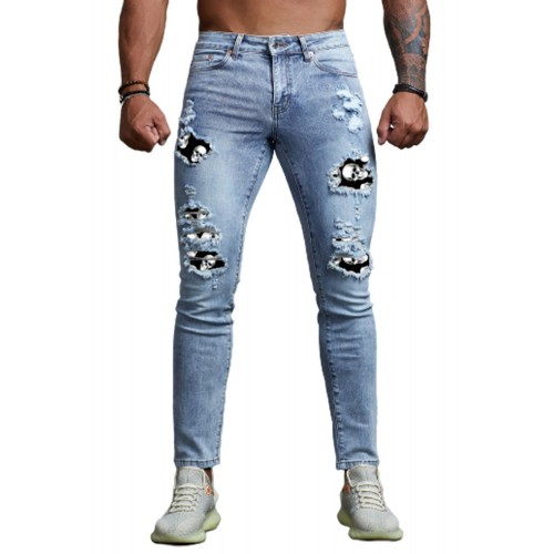 Sky Blue Men's Ripped Ghost Patches Slim Fit Skinny Jeans