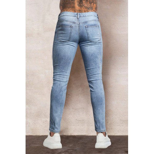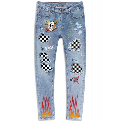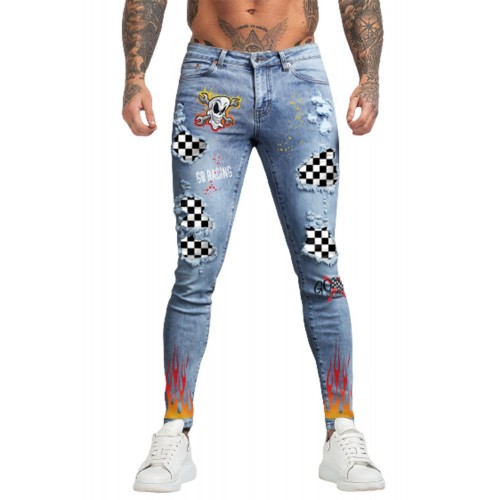 Sky Blue Plaid Ghost Print Patchwork Skinny Fit Men's Jeans