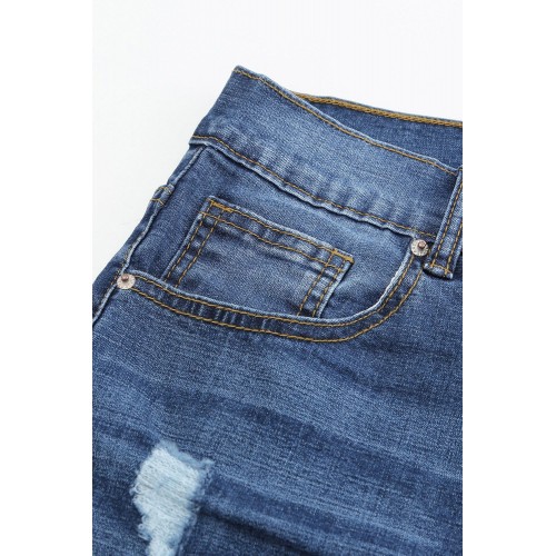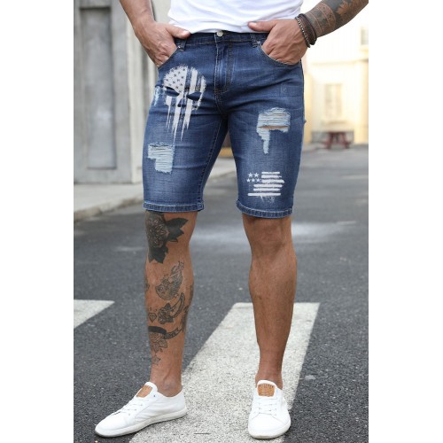 Blue American Flag Skull Print Skinny Distressed Men's Denim Shorts