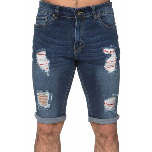 Sky Blue Men's Baseball Pattern Patchwork Skinny Distressed Jeans