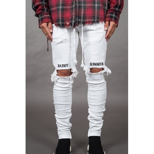 White Letter Striped Print Ripped Slim-fit Men's Jeans