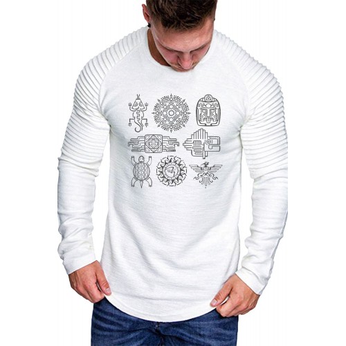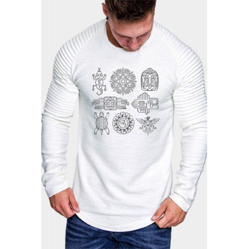 Men's Graphic Print Slim-fit Pleated Long Sleeve T-shirt