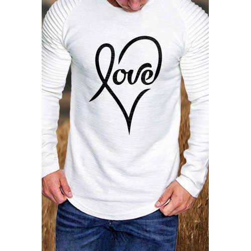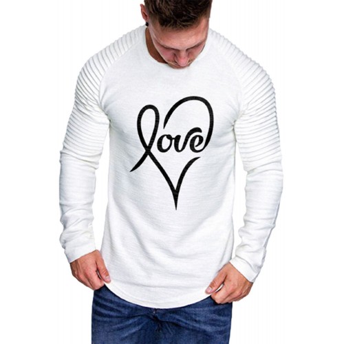 White Men's Love Heart Shape Print Pleated Long Sleeve T-shirt