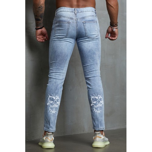 Light Wash Skull Print Patchwork Frayed Slim Fit Men's Jeans