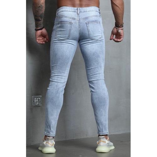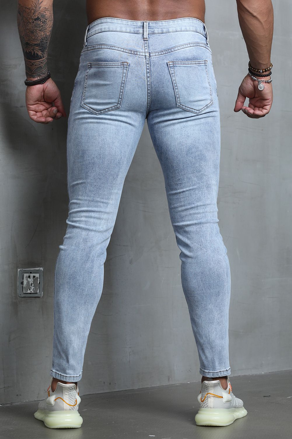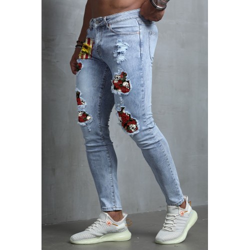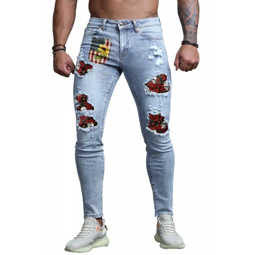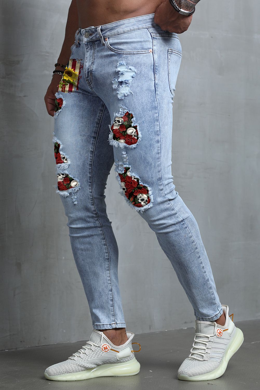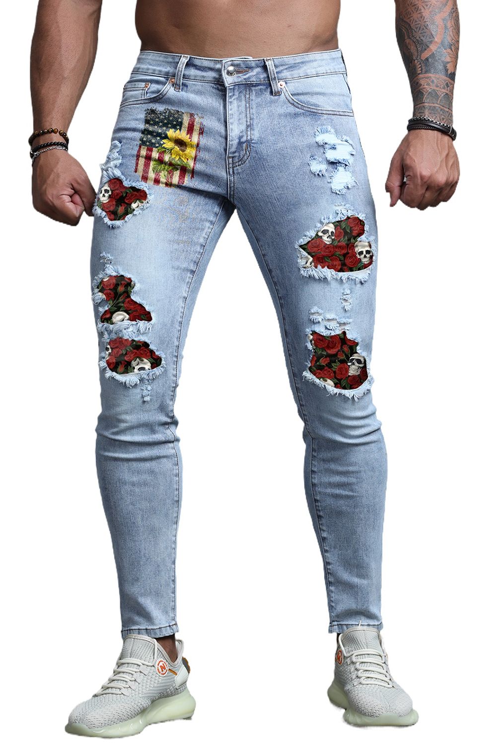American Flag Floral Skull Print Patchwork Skinny Men's Jeans